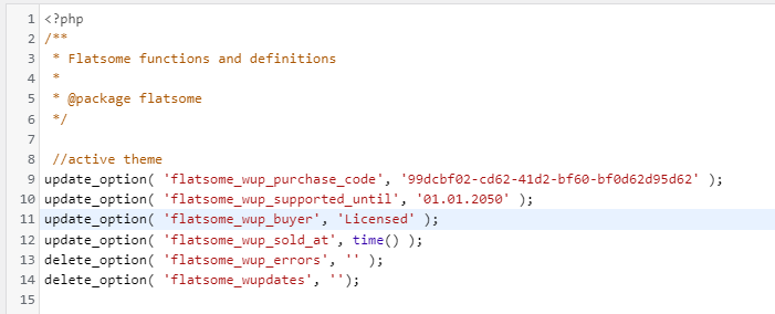 update_option( ‘flatsome_wup_buyer’, ‘Licensed’ );