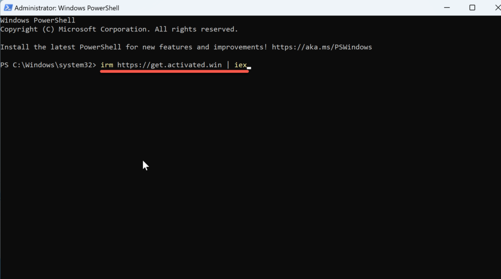 Bước 3: Copy dòng này vào PowerShell rồi Enter: irm https://get.activated.win | iex
