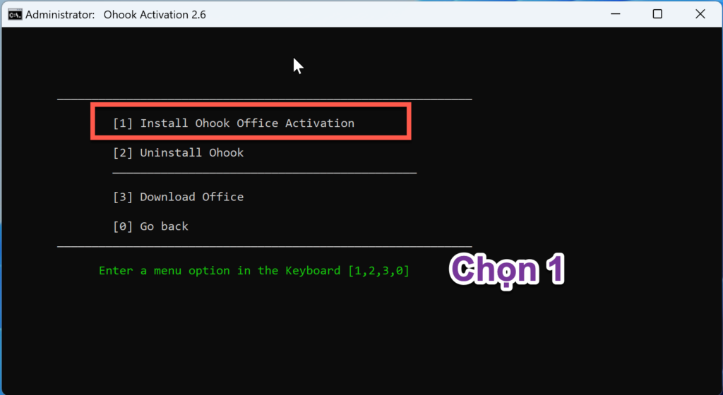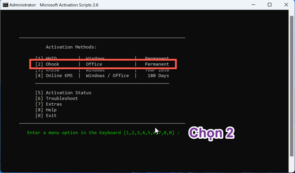 Bước 4: Chọn 2 để kích hoạt Office (Ohook)